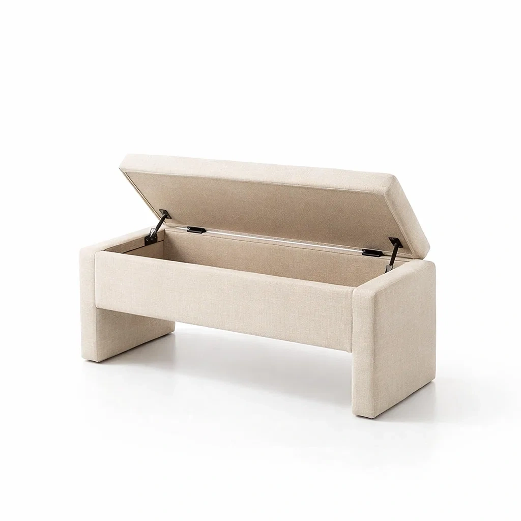 Panca contenitore in lino beige con struttura in legno