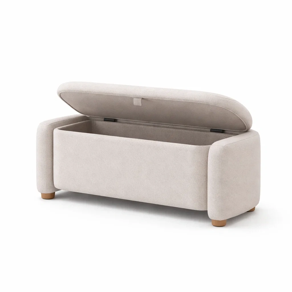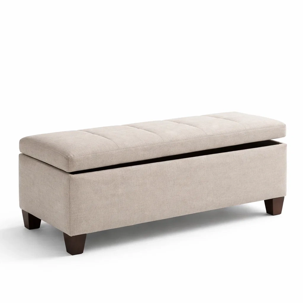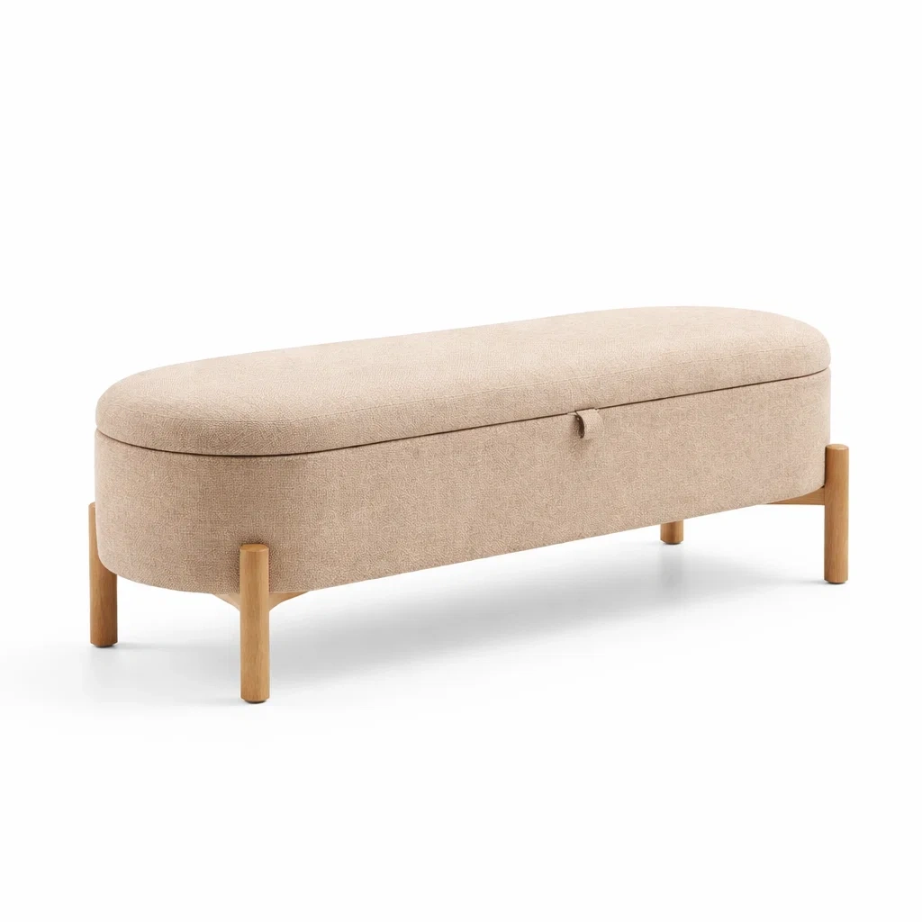 Panca contenitore in tessuto beige con gambe in legno