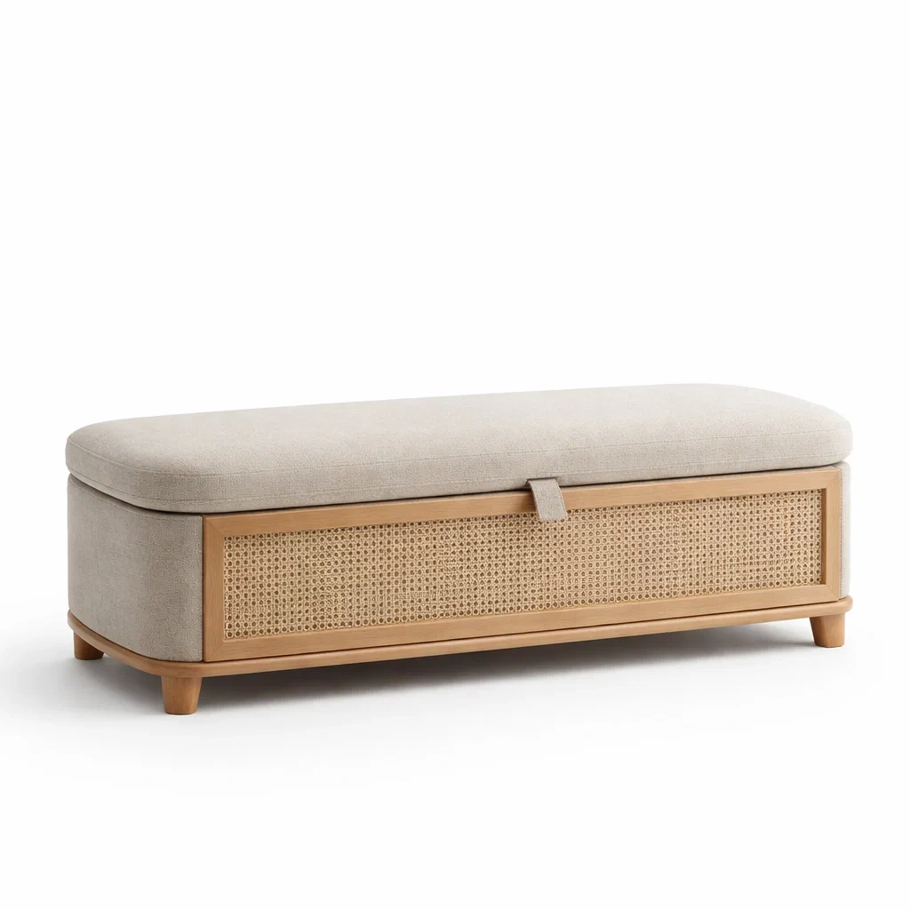 Panca contenitore in tessuto beige con struttura in legno e rattan