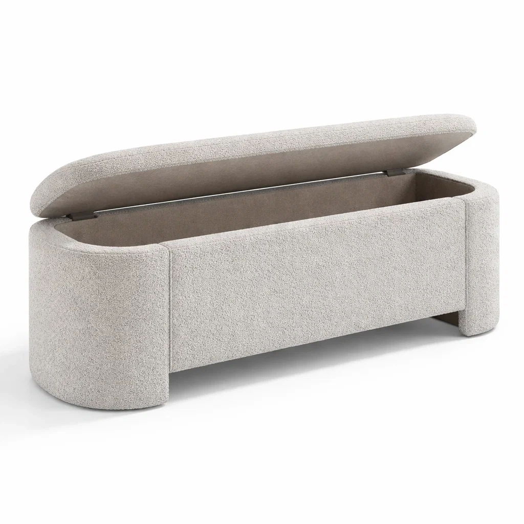 Panca contenitore in tessuto bouclé grigio chiaro con struttura in legno compensato