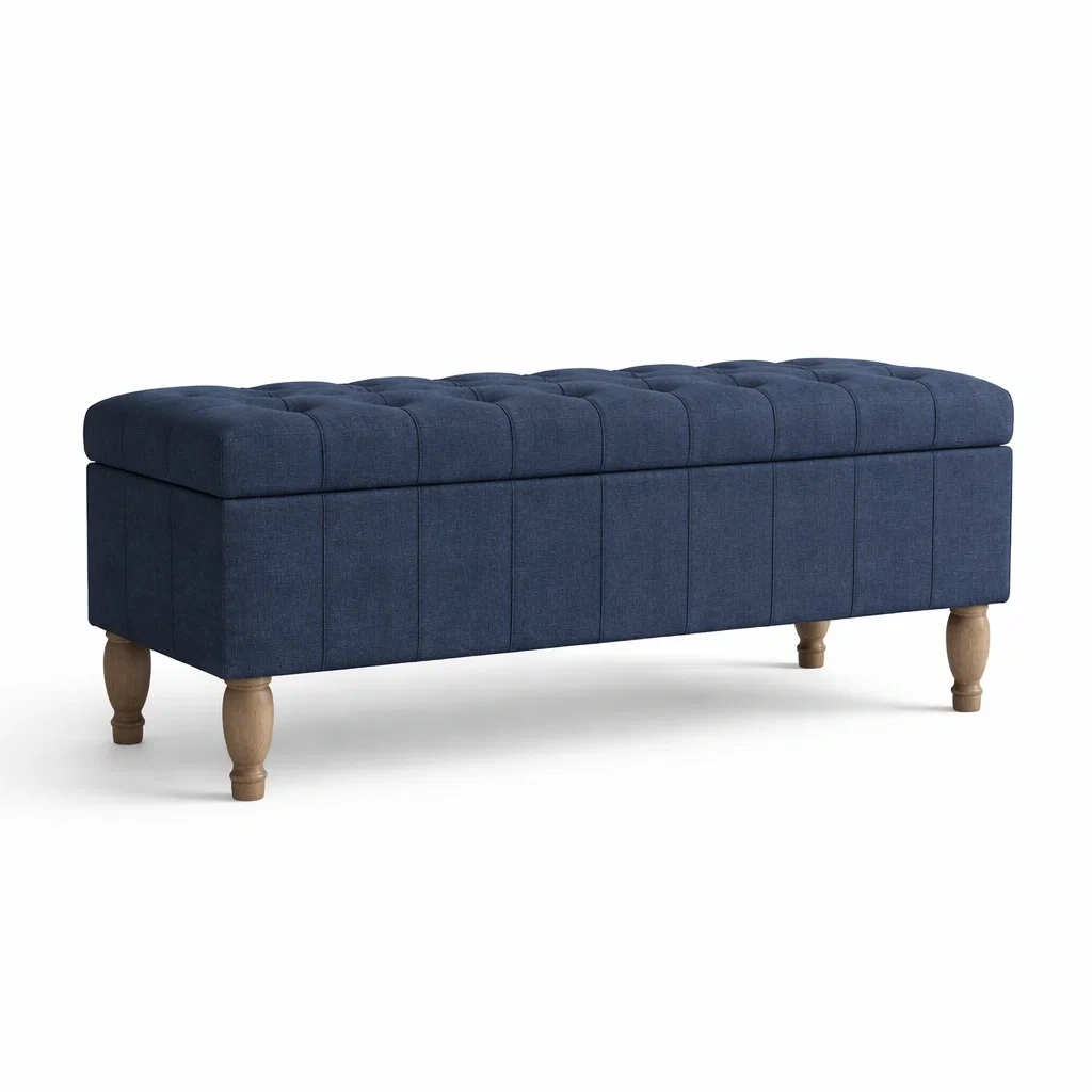 Panca contenitore in tessuto blu con gambe in legno