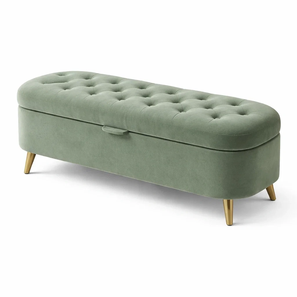 Panca contenitore imbottita beige con gambe in legno