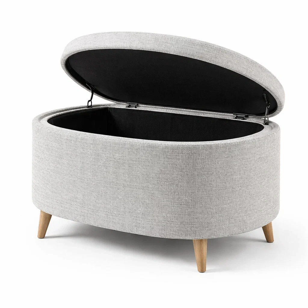 Panca contenitore ovale in legno e tessuto grigio