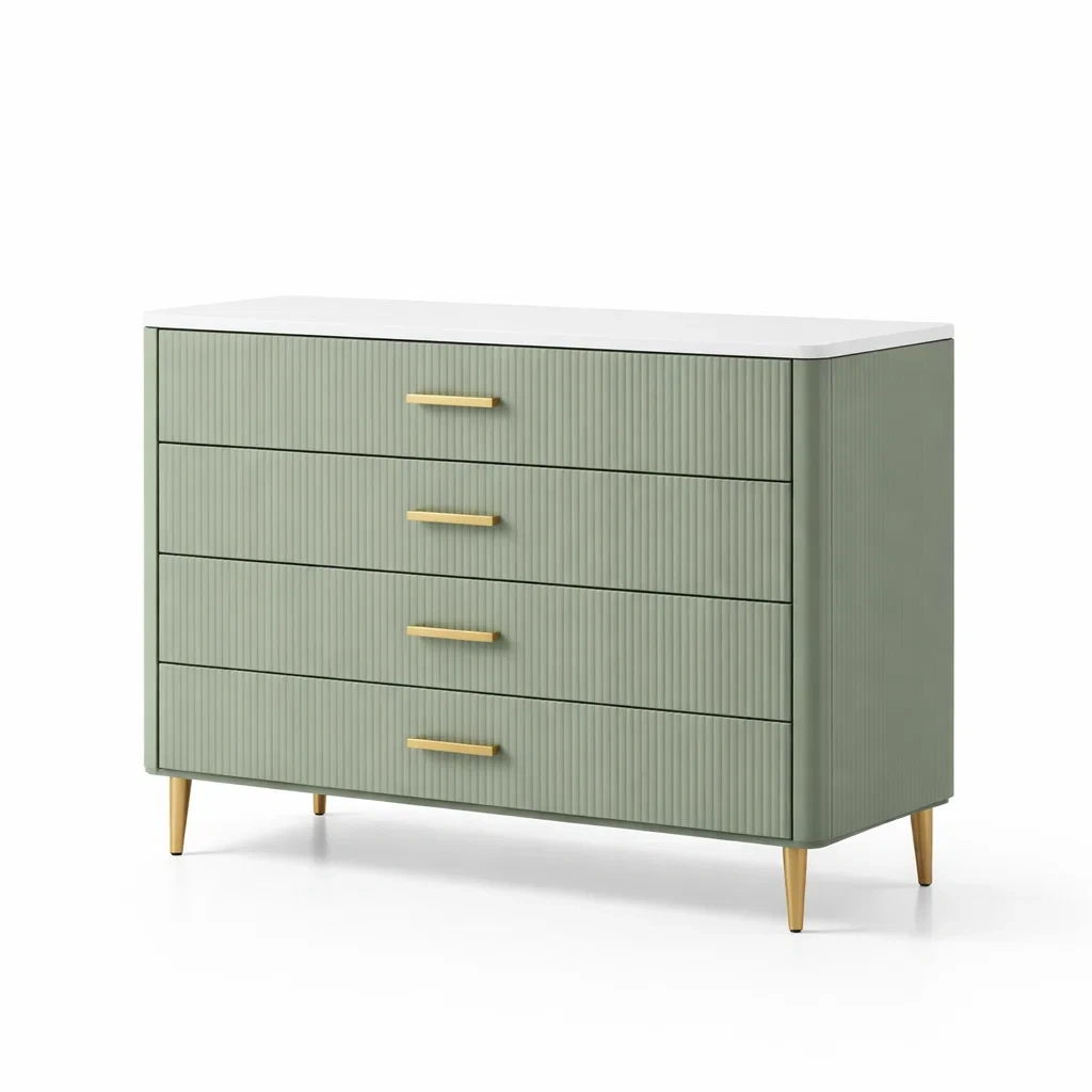 Questa cassettiera è realizzata in MDF con una superficie rivestita in melammina. I cassetti sono provvisti di maniglie dorate ed hanno un meccanismo di scorrimento liscio. La struttura verde aggiunge un tocco elegante al design.