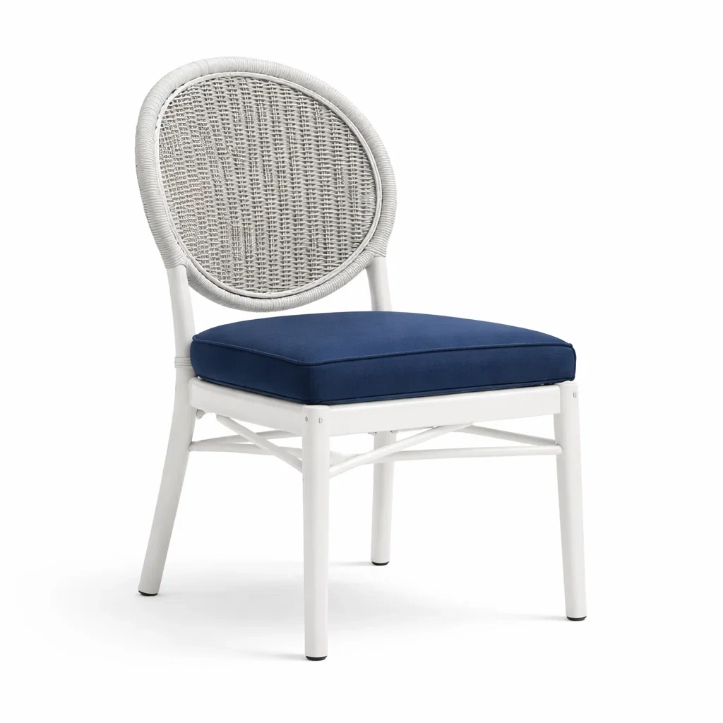 Materiale: struttura in alluminio, schienale in rattan intrecciato, seduta imbottita in tessuto di poliestere