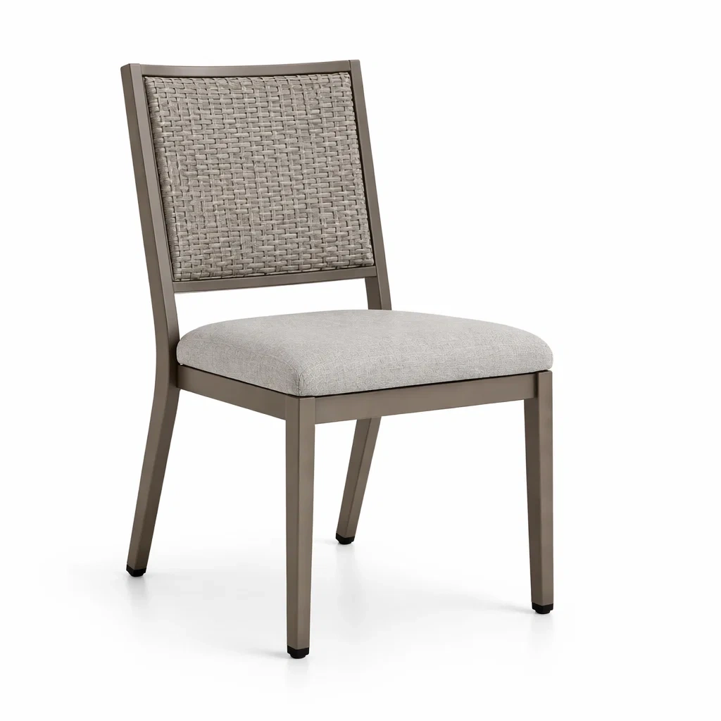 Materiale: Struttura in alluminio, schienale intrecciato in rattan sintetico, seduta imbottita in tessuto di poliestere